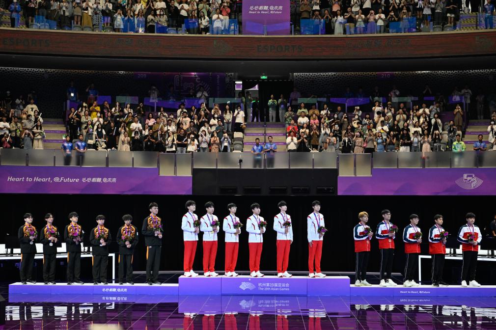 2023年9月26日,在杭州亚运会电子竞技王者荣耀亚运版本决赛中,中国队以2比0战胜马来西亚队,获得冠军,图为冠军中国队(中)、亚军马来西亚队(左)和季军泰国队在颁奖仪式上。新华社记者 颜麟蕴 摄