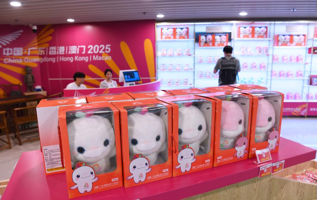 这是7月14日在香港西九龙站官方零售店拍摄的全运会吉祥物“喜洋洋”和“乐融融”。当日,第十五届全国运动会香港赛区官方特许商品开始发售。新华社记者 陈铎 摄