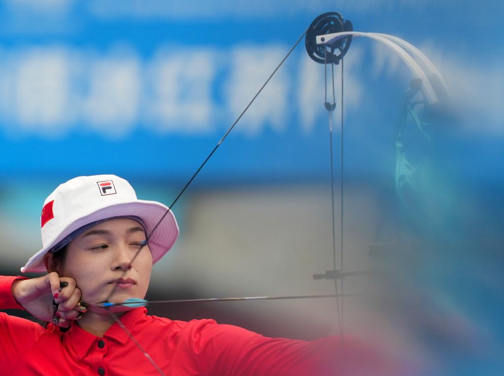 11月20日,江苏队选手张心妍在全运会射箭复合弓混合团体金牌决赛中。新华社记者 郝源 摄