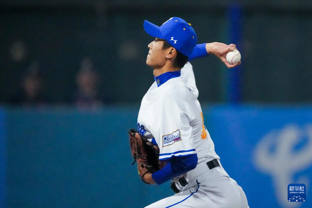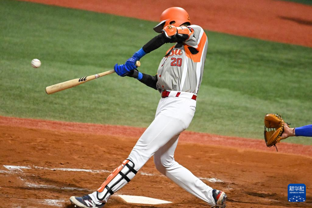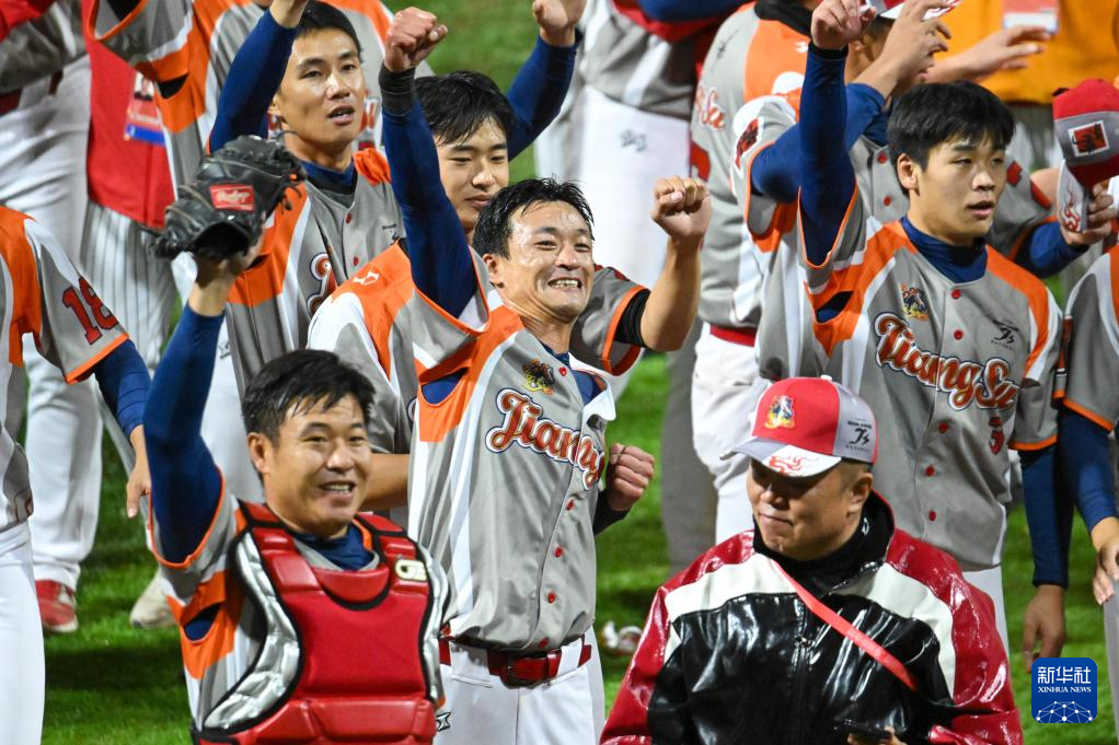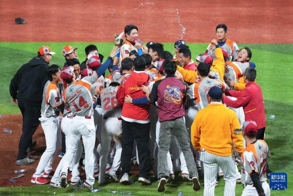 11月20日,江苏队球员庆祝队友陈晨(左二)在比赛中打出本垒打。
