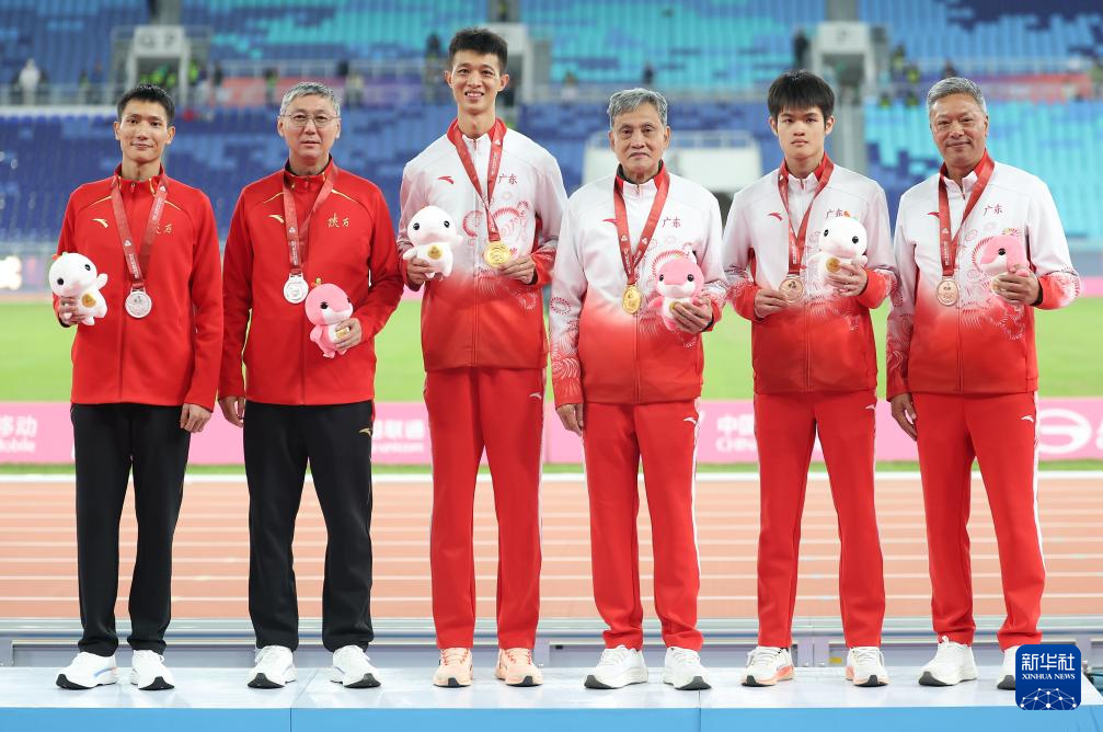 11月20日,获得冠军的广东队选手吴瑞庭(左三)、获得亚军的陕西队选手方耀庆(左一)、获得季军的广东队选手周荣嘉(右二)在颁奖仪式上与教练合影。