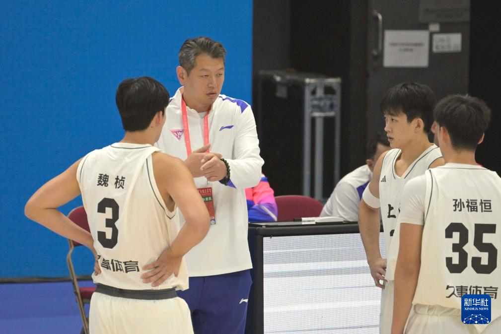 11月20日,北京队主教练陈磊(左二)在比赛间隙指导球员。