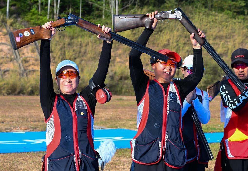第十五届全国运动会射击飞碟项目多向混合团体决赛20日在广州飞碟训练中心展开角逐。由上届全运会多向男、女冠军“联手出战”的湖南队郭雨浩/刘英姿以44中夺得冠军,陕西队肖金佳/段宇薇以42中摘得银牌,山东队于海成/柳珊珊获得第三名。