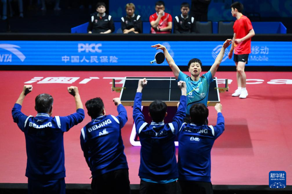 11月20日,北京队选手马龙(中)庆祝男单比赛获胜。他3比0战胜上海队选手周恺。