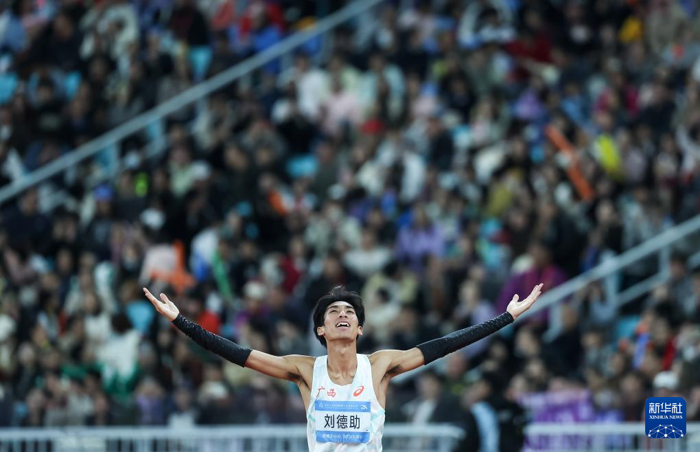 11月20日,广西队选手刘德助在比赛后庆祝夺冠。