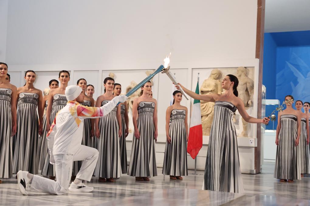 ↑11月26日,第一棒火炬手与扮演最高女祭司的演员玛丽·米娜交接火炬。新华社记者 李京 摄