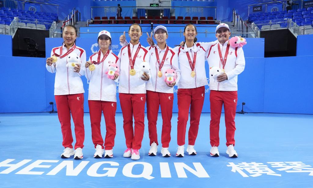 11月12日,在横琴进行的第十五届全国运动会网球项目青年组女子团体决赛中,冠军北京队在颁奖仪式后合影。新华社记者 颜麟蕴 摄