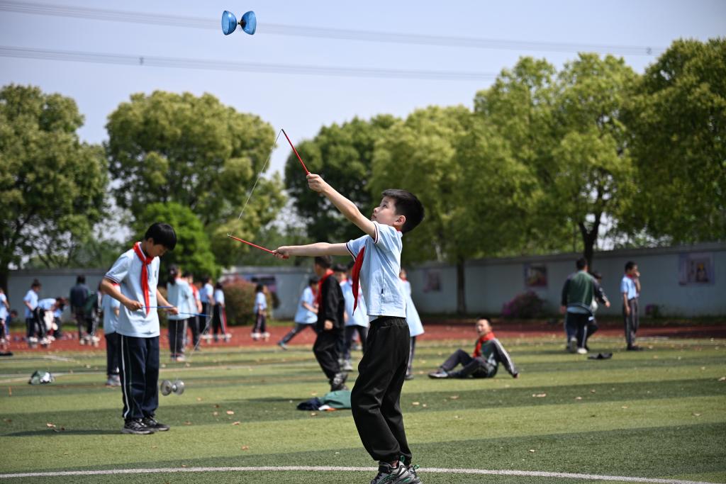 ↑4月23日,浙江省嘉兴市秀洲区磻溪教育集团桃园小学的学生在操场上抖空竹。新华社记者 刘铭翔 摄