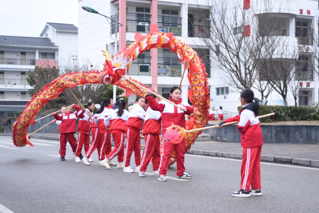 ↑2月25日,贵州省贵阳市花溪区青岩小学的学生在大课间练习舞龙。新华社记者 郑明鸿 摄