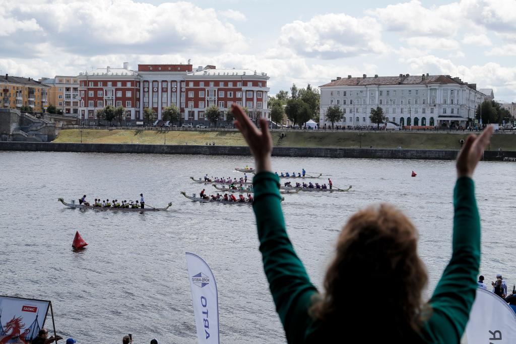 ↑7月5日,观众为参加龙舟挑战赛的选手们加油。当日,2025特维尔龙舟挑战赛在俄罗斯特维尔州首府特维尔市开幕。新华社发(亚历山大摄)