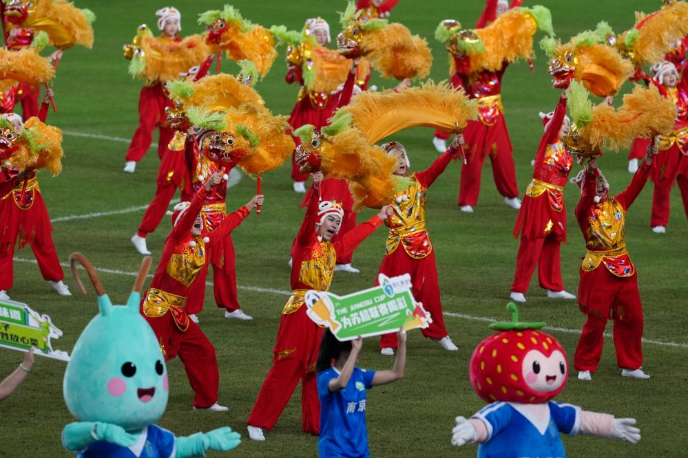 ↑10月18日,演员在江苏南京举行的2025江苏省城市足球联赛(“苏超”)南京队与泰州队的半决赛中场休息时表演。新华社记者 李博 摄