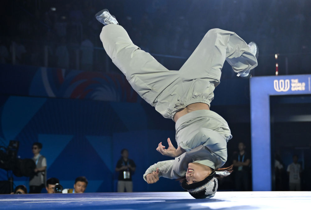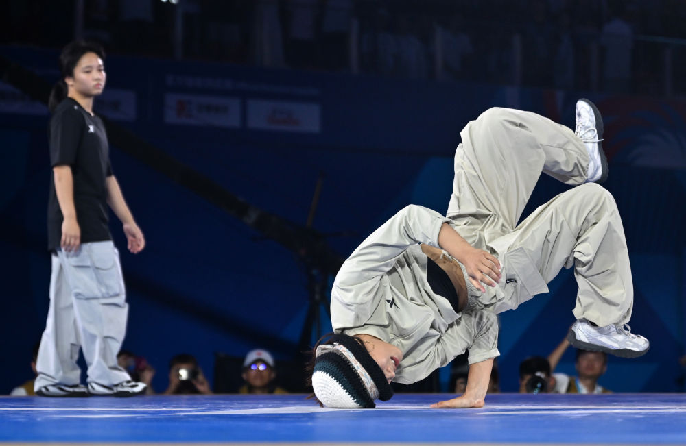 ↑8月17日,中国选手郭朴在2025年成都世运会女子单人霹雳舞决赛金牌战中。