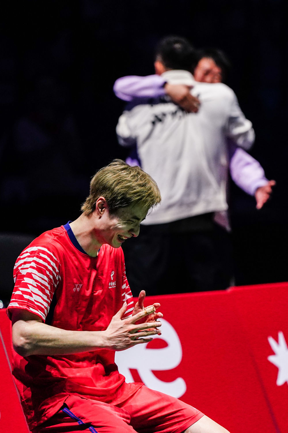 ↑4月30日,中国队选手李诗沣(左)在男单比赛中庆祝得分。最终,他2比1战胜泰国队选手王高伦。