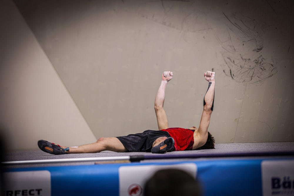 ↑6月15日,潘愚非庆祝夺得2025攀岩世界杯伯尔尼站男子攀石冠军。他成为第一个获得该项目世界杯分站赛冠军的中国选手。
