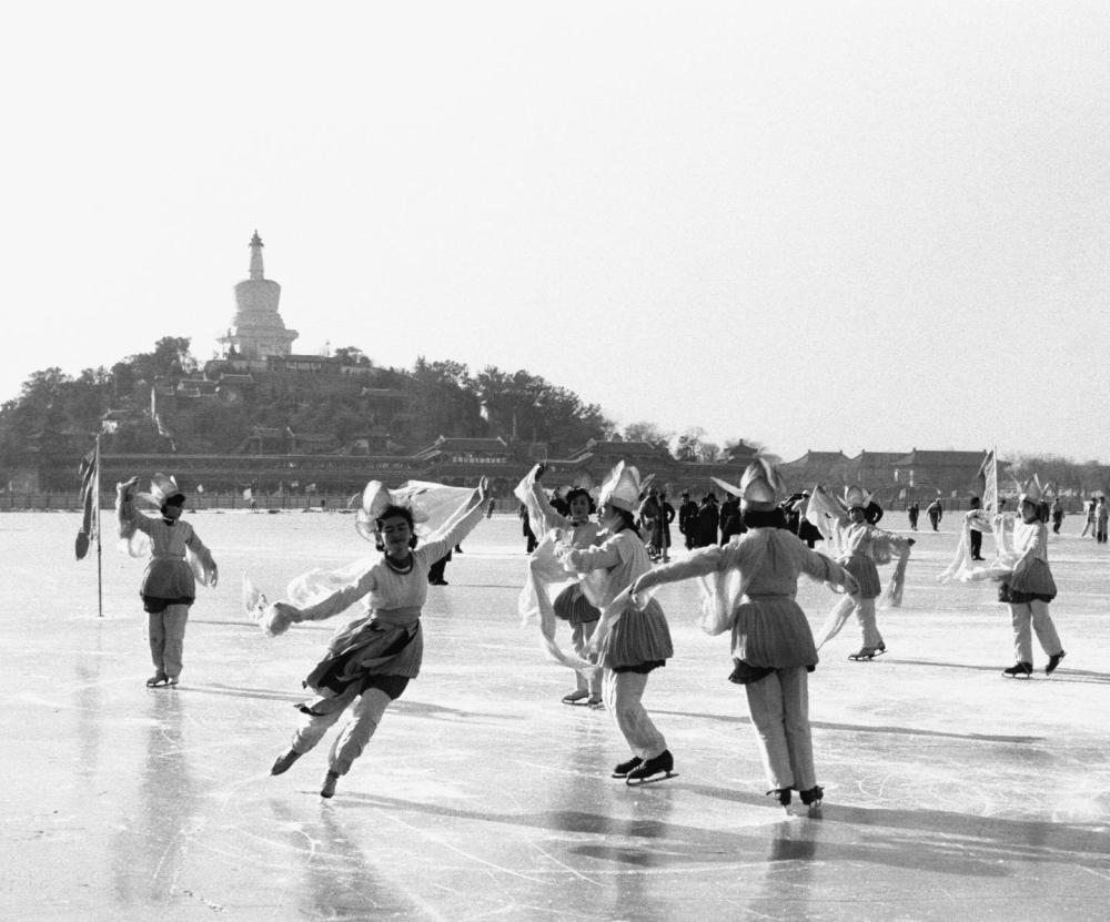 1980年1月13日,在北京北海公园举行具有我国民族特色的化装滑冰表演。图为九名少女表演的荷花舞。新华社记者宋连峰摄