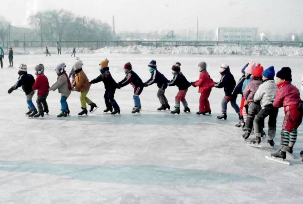2000年12月4日,哈尔滨市道外区一所幼儿园的孩子在滑冰场上玩游戏。新华社记者周确摄