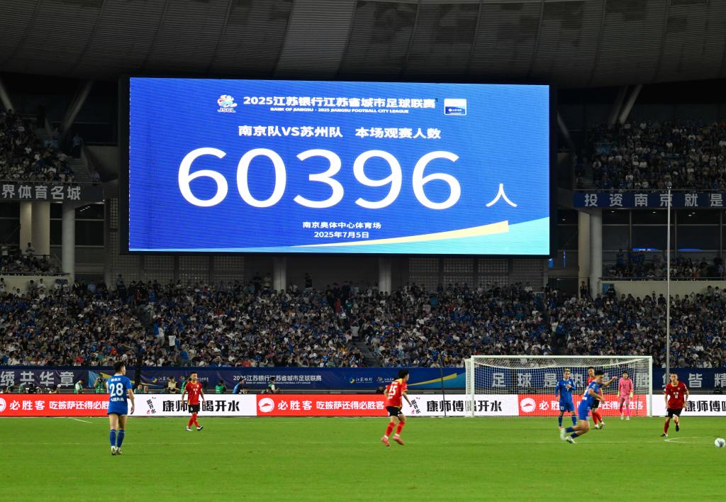 2025年7月5日,球场大屏显示本场比赛共有60396名观众到场观赛,打破江苏省城市足球联赛单场上座纪录。当日,在江苏南京举行的2025江苏省城市足球联赛第六轮比赛中,南京队主场0比0战平苏州队。新华社记者 季春鹏 摄