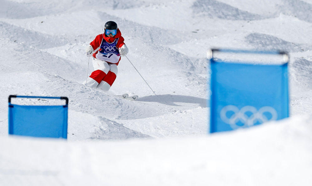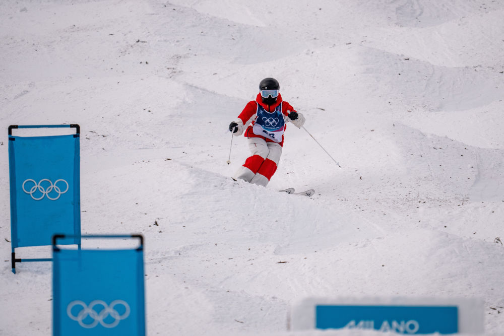 这是所有滑雪项目中公认最难稳定驾驭的地形之一——选手在布满密集雪包的陡峭赛道上高速滑降的同时,需要像猫科动物一样灵活地跳跃、回转,并在两个跳台上完成空中动作。
