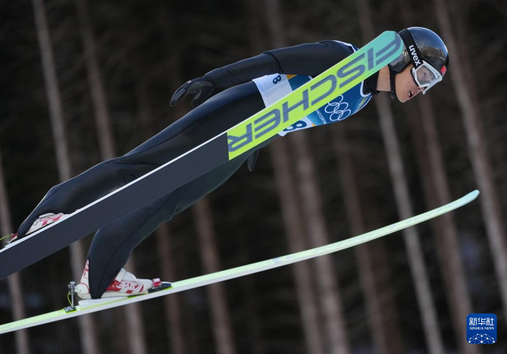 2月17日,中国选手赵子贺在北欧两项个人大跳台试跳轮中。