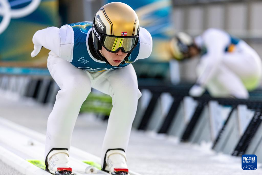 2月17日,挪威选手奥夫特布罗在个人大跳台试跳轮中。