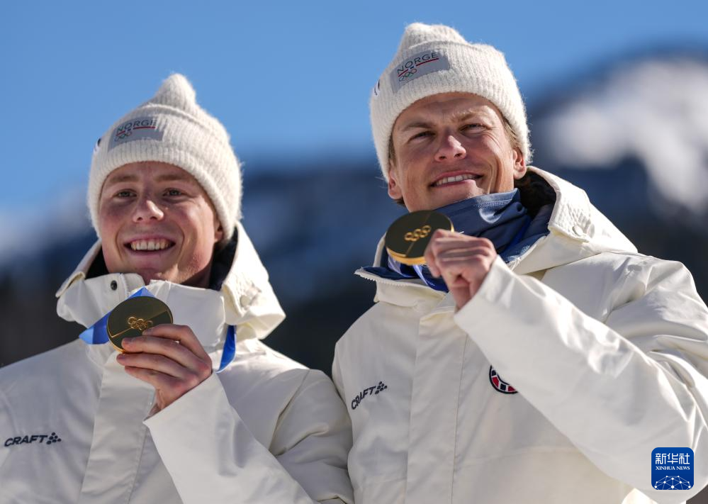 2月18日,冠军挪威队选手赫德加特、克莱博(右)在颁奖仪式上。