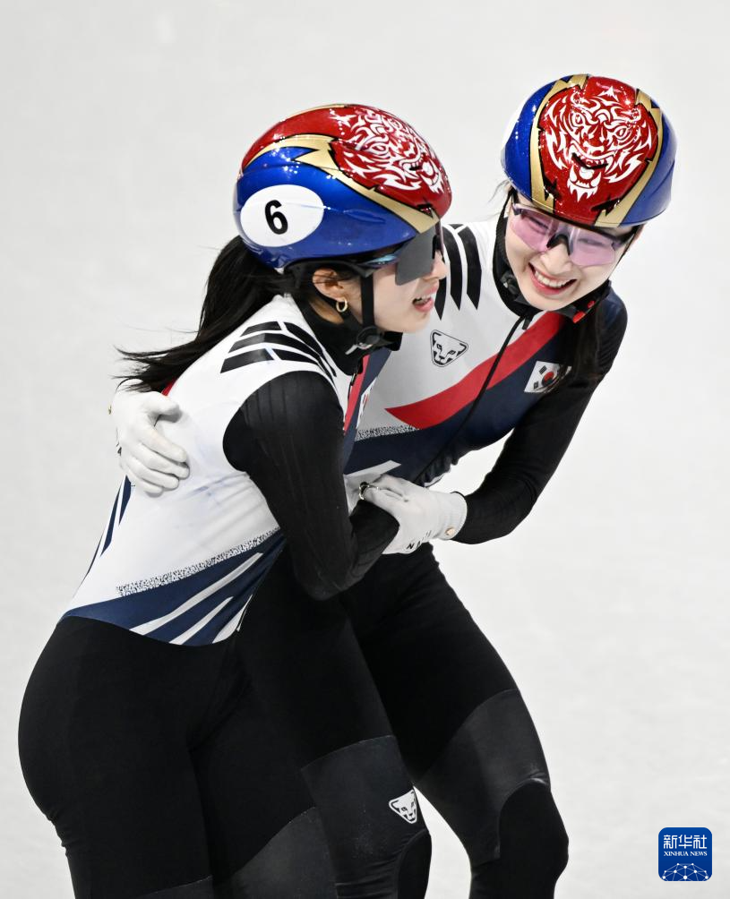 2月18日,韩国队选手金吉莉(右)率先撞线后庆祝。