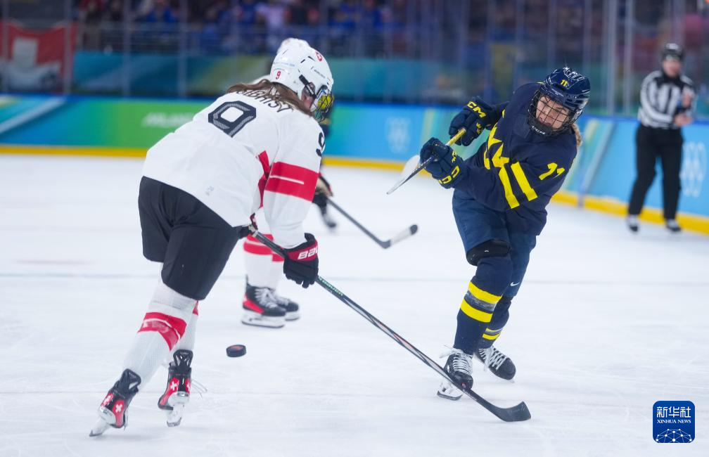 2月19日,瑞典队球员约翰松(右)与瑞士队球员西格里斯特在比赛中拼抢。