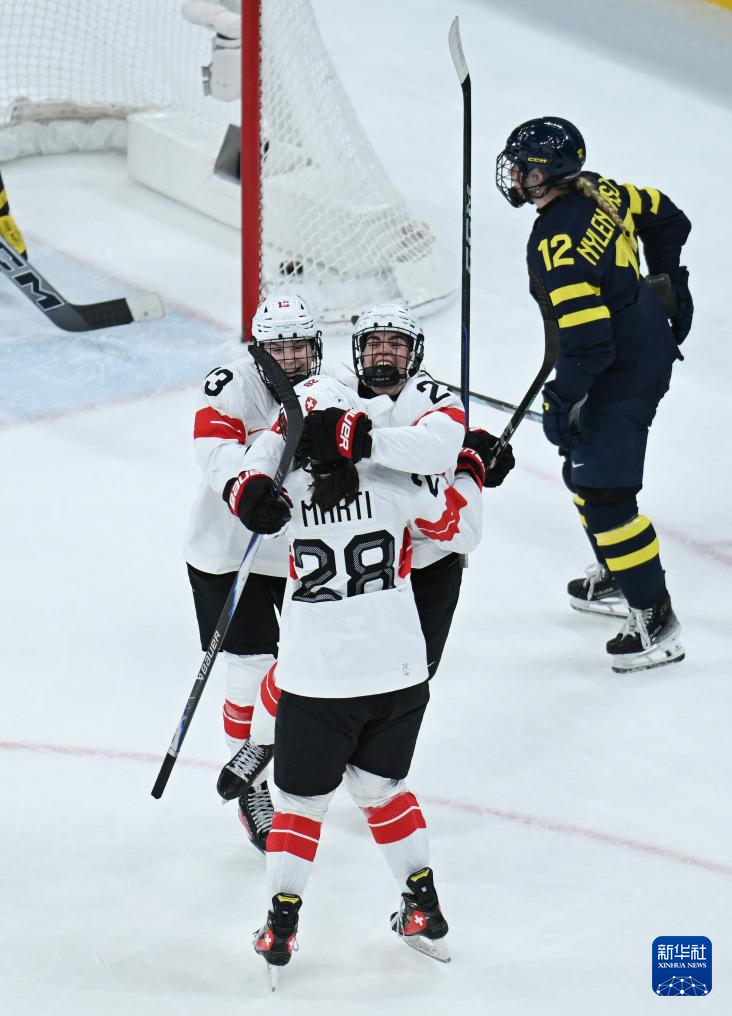 2月19日,瑞士队球员阿林娜·米勒(中)在加时赛中攻入制胜球后庆祝。