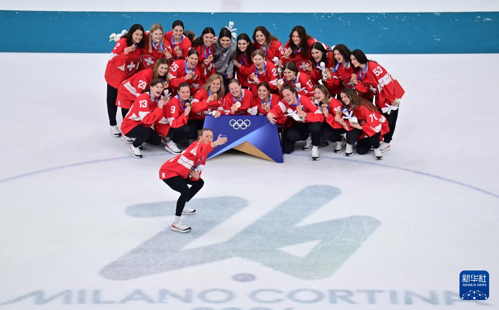 2月19日,季军瑞士队在颁奖仪式后合影。