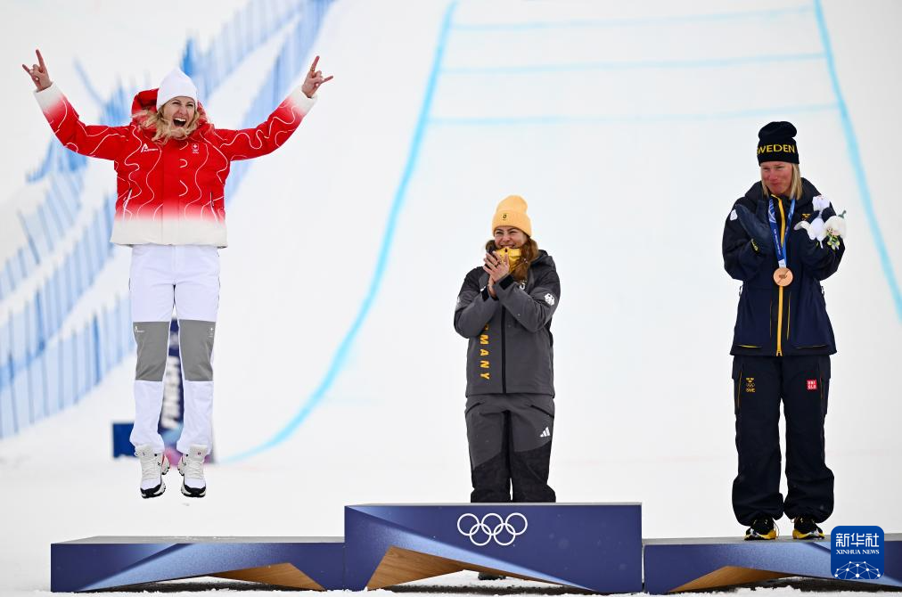 2月20日,冠军德国选手达妮埃拉·迈尔(中)、亚军瑞士选手范妮·史密斯(左)、季军瑞典选手桑德拉·内斯隆德在颁奖仪式上合影。