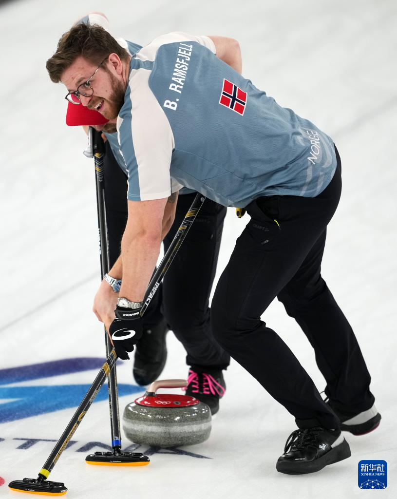 2月20日,挪威队选手芒努斯·拉姆斯菲尔(中)在比赛中掷壶。