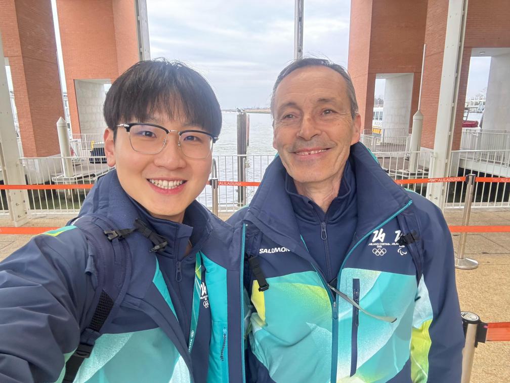 ↑在科尔蒂纳冰壶馆前的引导志愿者钟昕