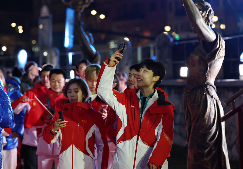 ↑中国速度滑冰运动员殷琦(右)在闭幕式入场。