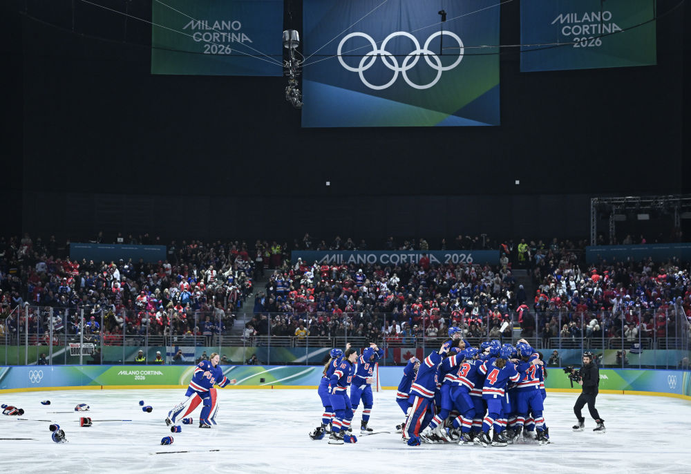 2月20日,美国队在赛后庆祝冰球女子金牌赛夺冠。新华社记者 张豪夫 摄