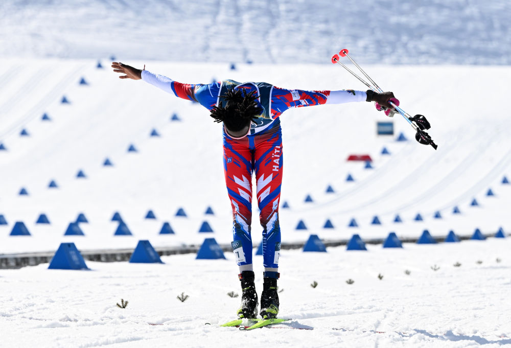 2月8日,在米兰冬奥会越野滑雪男子双追逐(10公里传统技术+10公里自由技术)比赛中,海地选手萨瓦尔冲线后向现场观众致意。尽管萨瓦尔是成绩单上完赛选手中的最后一位,他依然赢得了全场观众的掌声与欢呼。新华社记者 贺灿铃 摄