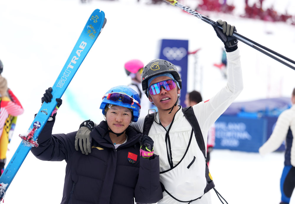 2月21日,中国队选手布鲁尔(右)、次旦玉珍在滑雪登山混合接力比赛后合影。他们获得第八名。新华社记者 胡虎虎 摄