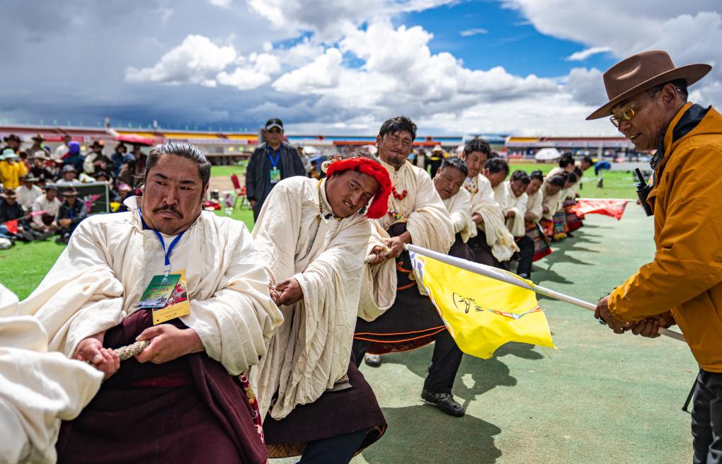 2025年9月6日,在那曲市恰青赛马节现场,农牧民参加拔河比赛。新华社记者 丁增尼达 摄