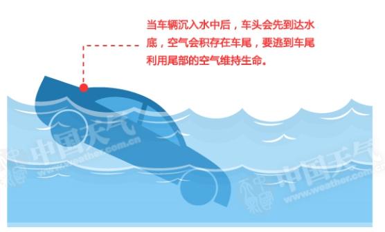 當水位已漫及車窗但未高過車窗時,車門無法打開,從天窗或搖下側窗玻璃逃生。當車輛沉入水中后,車頭會先到達水底,空氣會積存在車尾,要逃到車尾,利用尾部的空氣維持生命。深吸一口氣,打開車門或砸爛車窗逃出。