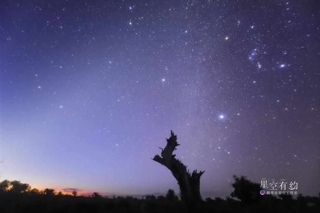 北京市天文愛好者王俊峰2019年10月7日在新疆哈密伊吾胡楊林拍攝的獵戶座(參宿三星清晰可見)。(本人供圖)