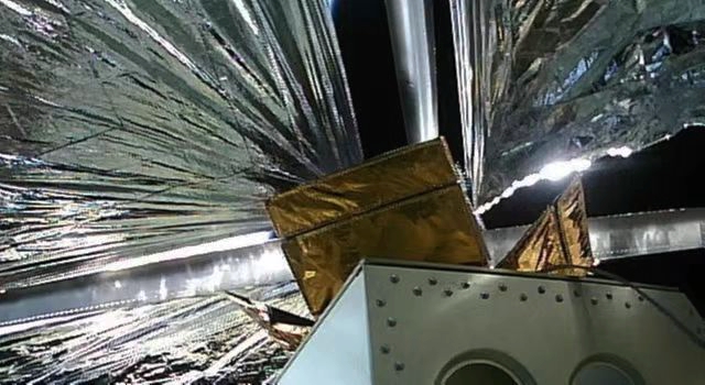 長征二號丁遙六十四運載火箭載荷艙的離軌帆在太空展開情景。(中國航天科技集團八院供圖)