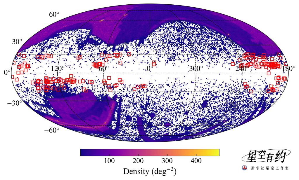 圖為類星體在銀道坐標系中的分布,紅色方框代表此次通過光譜觀測發現的204個銀道面背景類星體。(由受訪者提供)