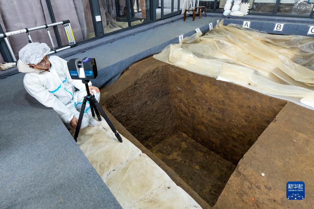 在三星堆遺址考古發掘現場,考古人員用三維激光掃描儀掃描7號“祭祀坑”,并將利用掃描數據建立該“祭祀坑”的3D模型(2021年3月10日攝)。新華社記者 沈伯韓 攝