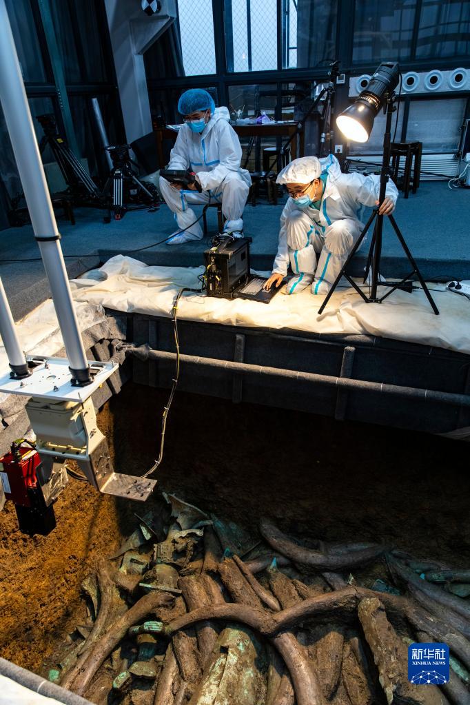 在三星堆遺址考古發掘現場3號“祭祀坑”,考古人員用高光譜成像掃描儀對文物進行光譜拍攝,以識別文物的材料和屬性(2021年3月16日攝)。新華社記者 沈伯韓 攝