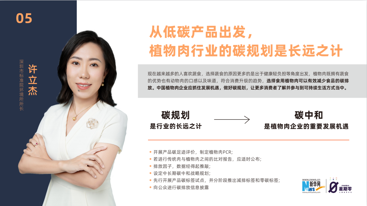 深圳市标准院环境所所长许立杰表示,现在越来越多的人喜欢蔬食,选择蔬食的原因更多的是出于健康轻负担等角度出发,植物肉既拥有蔬食 的优势也有动物肉的口感以及味道,符合消费升级的趋势,选择食用植物肉可以有效减少食品的碳排放。中国植物肉企业应抓住发展机遇,做好碳规划,让更多消费者了解并参与到可持续生活方式当中。