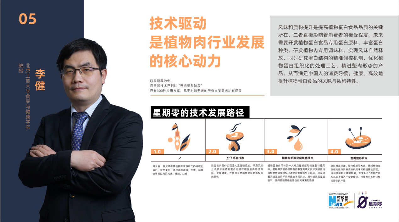 北京工商大学食品与健康学院教授李健表示,“风味和质构提升是提高植物蛋白食品品质的关键所在,二者直接影响着消费者的接受程度。未来需要开发植物蛋白食品专用蛋白原料,丰富蛋白种类,研发植物肉专用调味料,实现风味自然释放,同时研究蛋白结构的精准调控机制,优化植物蛋白组织化的处理工艺,精进整肉形态的产品,从而满足中国人的消费习惯。健康、高效地提升植物蛋白食品的风味与质构特性。”