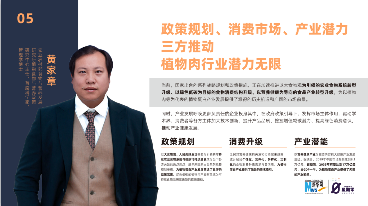 农业农村部食物与营养发展研究所植物食物与营养政策研究中心主任、首席科学家黄家章表示,“当前,国家出台的系列战略规划和政策措施,正在加速推进以大食物观为引领的农业食物系统转型升级、以绿色低碳为目标的食物消费结构升级、以营养健康为导向的食品产业转型升级,为以植物肉等为代表的植物蛋白产业发展提供了难得的历史机遇和广阔的市场前景。同时,产业发展呼唤更多负责任的企业投身其中,在政府政策引导下,发挥市场主体作用,驱动学术界、消费者等各方主体加大技术创新、提升产品品质、挖掘增值减碳潜力、提高绿色消费意识,推动产业健康发展。”