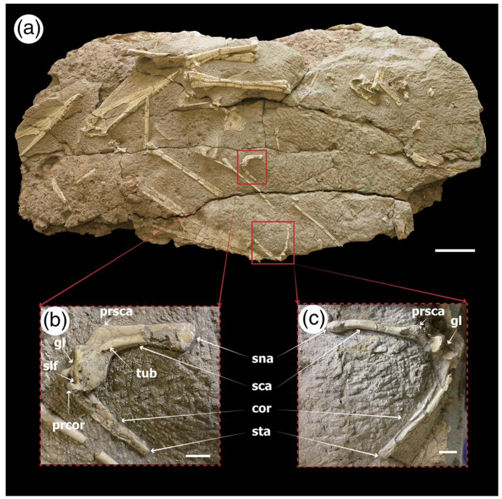 此次,科研團隊通過對新疆哈密早白堊世的湖相地層產出的哈密翼龍肩帶進行研究發現,哈密翼龍的喙上肌如同鳥類一樣繞行頂烏喙突內側連接肱骨近端,頂烏喙突可能實現類似的滑輪功能,說明翼龍可能如鳥類一樣利用喙上肌收縮實現翅膀上揚。研究還發現,哈密翼龍的肩臼窩疑似保留有軟骨組織,表明翼龍的肩臼窩可能與鳥類一樣具有厚實的關節軟骨以緩沖飛行壓力。