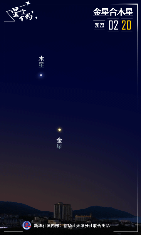 本次相合發生在傍晚,時間段非常友好,正好適合我國觀測。此時,金星亮度為-3.9等,木星亮度為-2.1等,兩星最近時的角距離只有33角秒,和滿月的視直徑(0.5度)差不多。日落時,金星與木星的地平高度達28度,可觀測時間近2個小時。由于這兩顆行星都非常明亮,即使是在光污染較為嚴重的城市,也能用肉眼輕松捕捉到它們的身影。