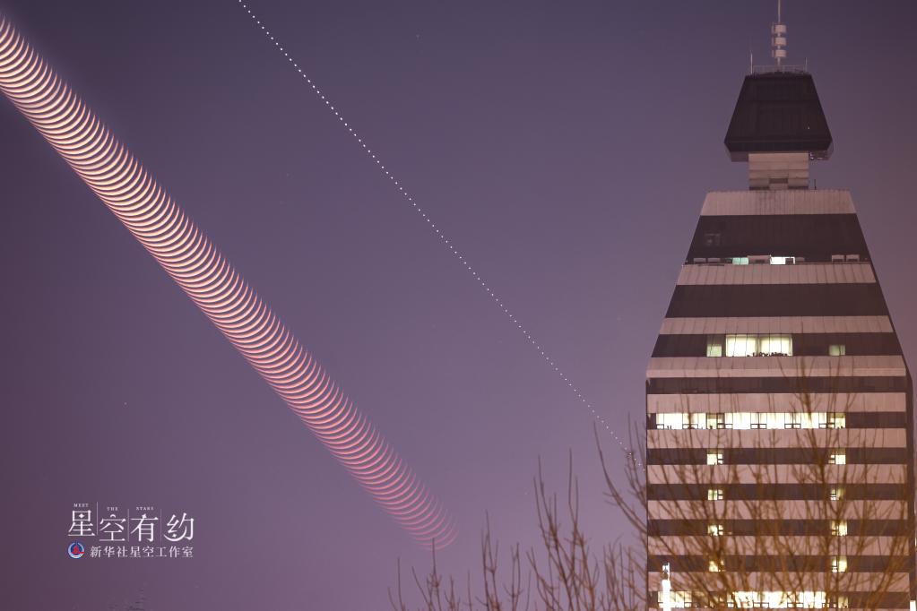 這是北京市天文攝影愛好者王俊峰2023年2月22日在北京市西城區(qū)拍攝的金星伴月牙(多張軌跡疊加)。(本人供圖)