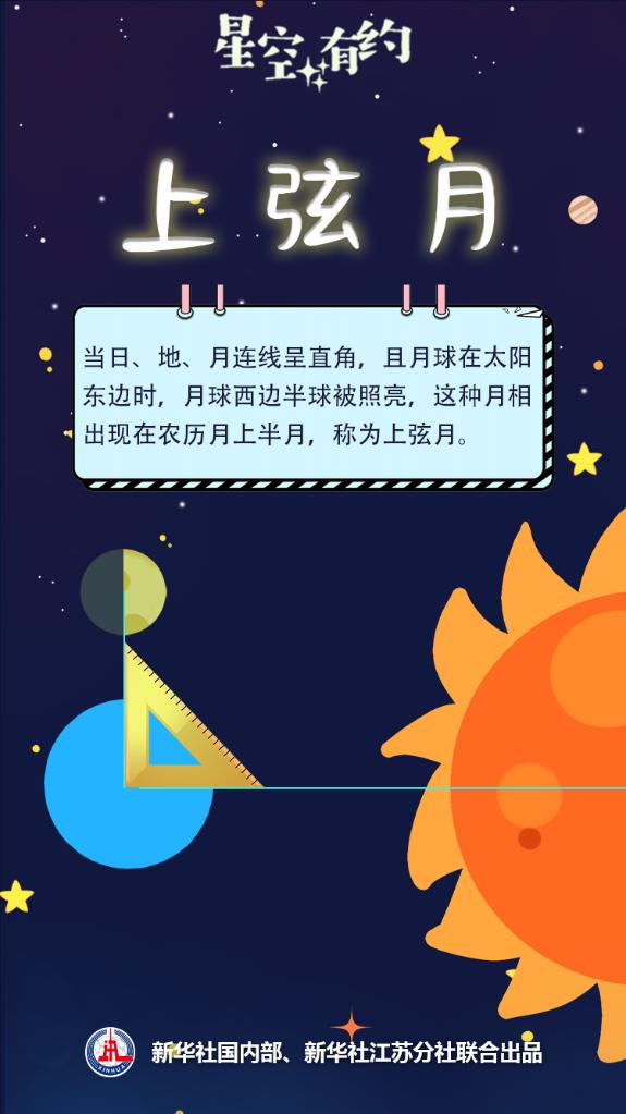 “太陽、地球、月球的位置不斷改變,因而月相也會產生變化。”中科院紫金山天文臺科普主管王科超說,當日、地、月連線呈直角,且月球在太陽東邊時,月球西邊半球被照亮,這種月相出現在農歷月上半月,稱為上弦月。